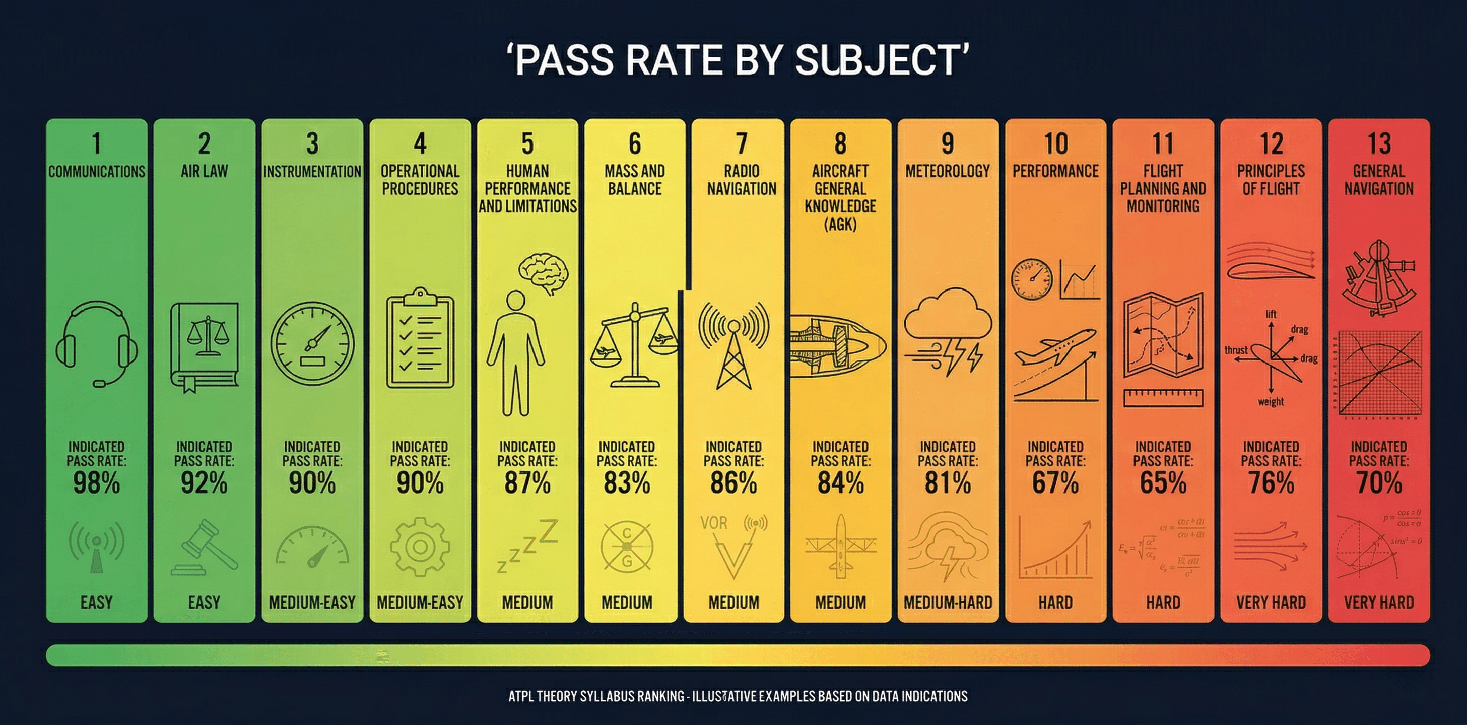 The 13 ATPL exams vary significantly in difficulty. Communications and Instrumentation consistently post the highest pass rates (above 85%), while Performance and Principles of Flight sit at the bottom with rates closer to 60%. The ranking below is based on EASA ECQB data and reflects the real experience of thousands of candidates — not what the textbooks tell you.