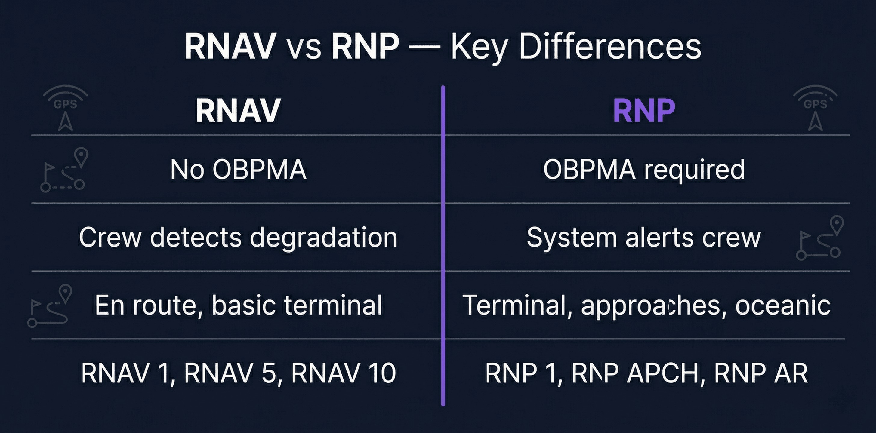 | Feature | RNAV | RNP | |---------|------|-----| | Full name | Area Navigation | Required Navigation Performance | | On-board monitoring & alerting (OBPMA) | NOT required | MANDATORY | | Crew notified of degradation? | No — crew must detect manually | Yes — automatic alert | | ATC confidence in tracking | Lower — no self-monitoring guarantee | Higher — system guarantees performance or alerts | | Enables curved approaches? | No | Yes (RNP AR APCH) | | Typical application | En route, basic terminal procedures | Terminal, approaches, oceanic with precision | | Example specifications | RNAV 5, RNAV 2, RNAV 1, RNAV 10 | RNP 4, RNP 1, RNP APCH, RNP AR APCH |